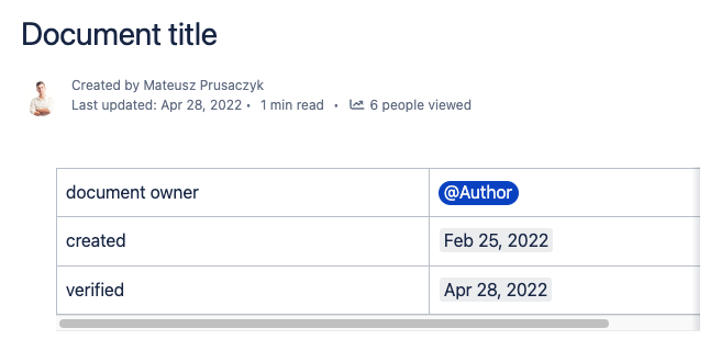 We could also maintain the metadata ourselves. However, that requires more self-discipline, maybe even an agreed-upon process in the team. We could either update the documents on a regular cadence, or with a more ad-hoc approach, e.g. whenever we update the document, verify if it’s still up-to-date, and adjust the verification timestamp.
