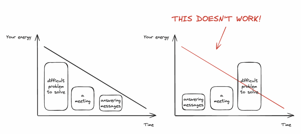 Use your day smart. You can start your day by working on an important project or “quickly” checking Slack (and find yourself super tired 6 hours later). Ask yourself a question: what is the cost of not working on the important project vs not answering the message?